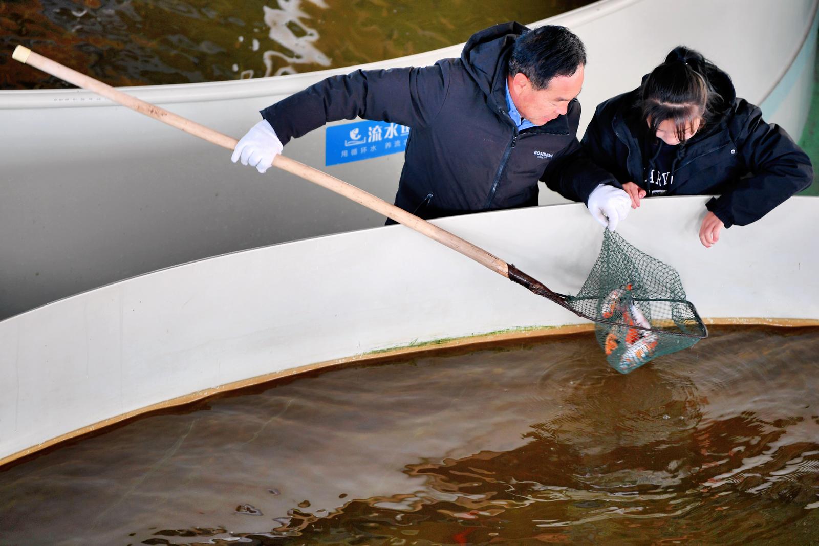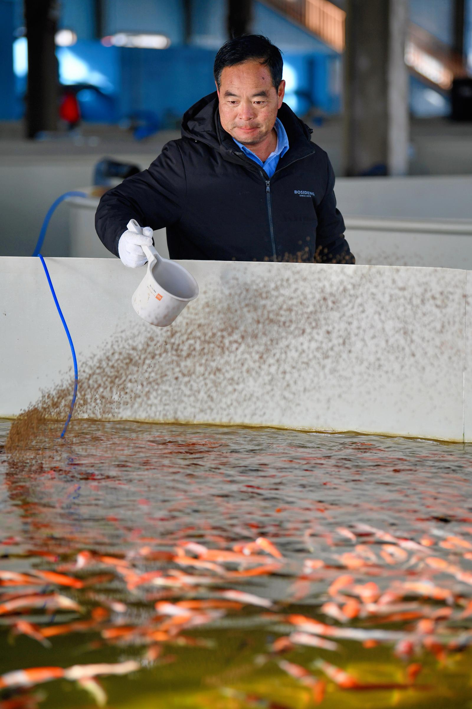 工作人员为鱼儿投喂饲料。