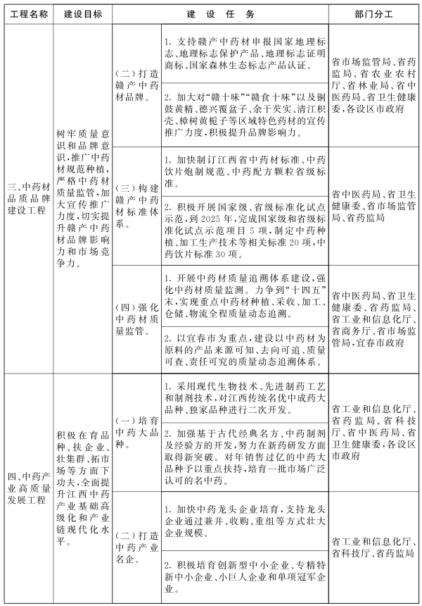 (一)提升赣产中药材品质。围绕“赣十味”“赣食十味”等赣产道地中药材,推进规模化、规范化种植。重点依托赣中道地药材、赣东特色药材、环鄱阳湖药食同源药材三大药材产区,高标准建设赣产道地药材生产基地。到“十四五”末,建成中药材定制药园50个、中药材种植示范基地20个,新建道地药材良种繁育、野生及仿野生基地和生产基地100万亩。