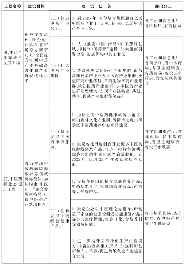 (四)持续推进中医药科技创新平台建设。加快推进中国(南昌)中医药科创城建设,建设一批中医药重点实验室、科技协同创新体、技术创新中心。支持优势企业与省内外高校、科研院所加大合作力度。推进中药固体制剂制造技术国家工程研究中心、经典名方现代中药创制全国重点实验室建设,积极发挥中国中医科学院中医药健康产业研究所、赣江中药创新中心、赣南创新与转化医学研究院等研发机构作用。