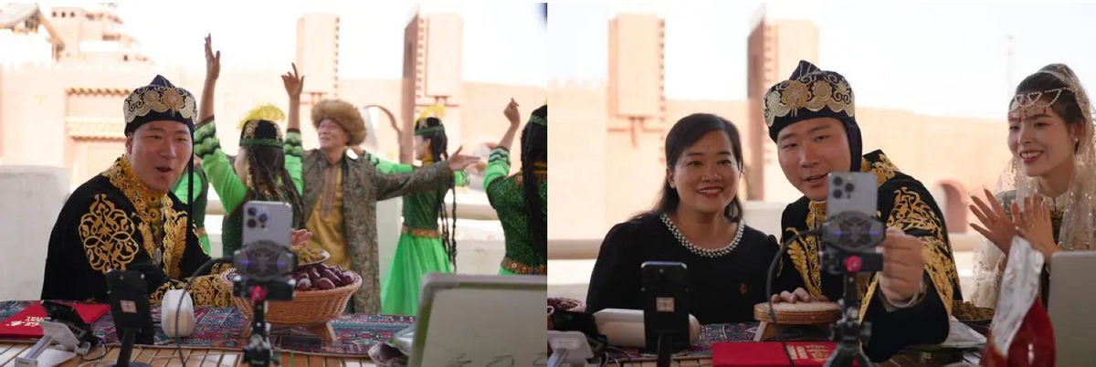 今年9月,快手好物推荐官华文来到和田县巴格其镇约特干故城,开启了首场新疆产品专场,直播过程中,华文向直播间的老铁们推荐了新疆大枣、核桃等数款当地特色干果、水果,而在他身后,刚刮过沙尘微微有些泛黄的天幕下,穿着华服扎着满头辫子的新疆姑娘围在一起,跳着节奏明快、自由奔放的新疆舞蹈。