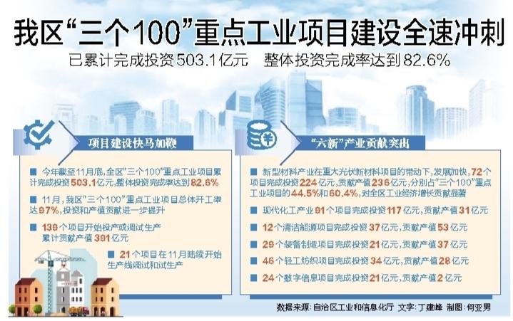 12月18日,记者从宁夏回族自治区工业和信息化厅获悉,宁夏紧盯“三个100”重点工业项目年终目标,全力推进项目建设,11月,项目总体开工率达97%,投资和产值贡献进一步提升。