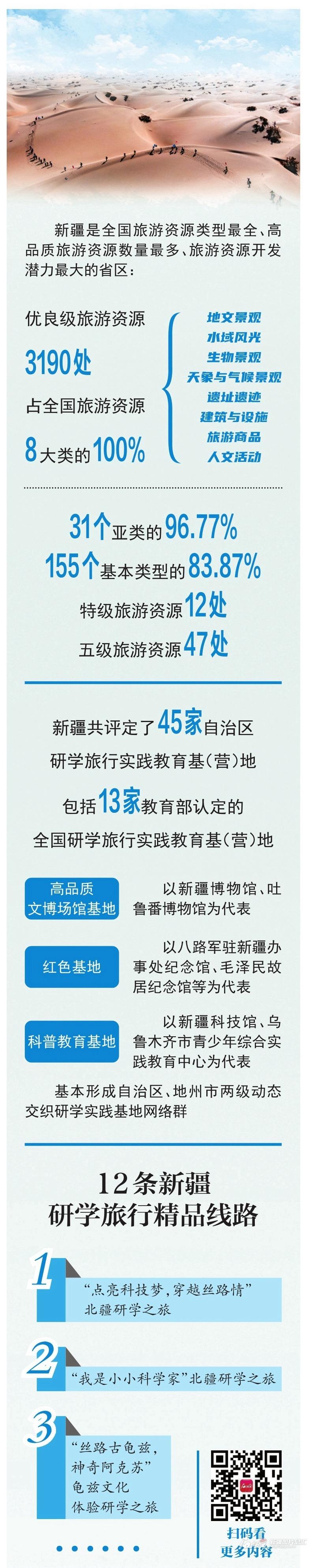 推进会发布了自治区首批12条研学旅行精品线路。“将重点在‘学’字上做文章,在‘研’字上下功夫,继续发掘研学资源,延伸研学价值,提升研学旅行服务水平,希望每一位来新疆研学实践的同学,都游有所感、学有所获。”自治区文化和旅游厅科技教育处处长汤太志说。