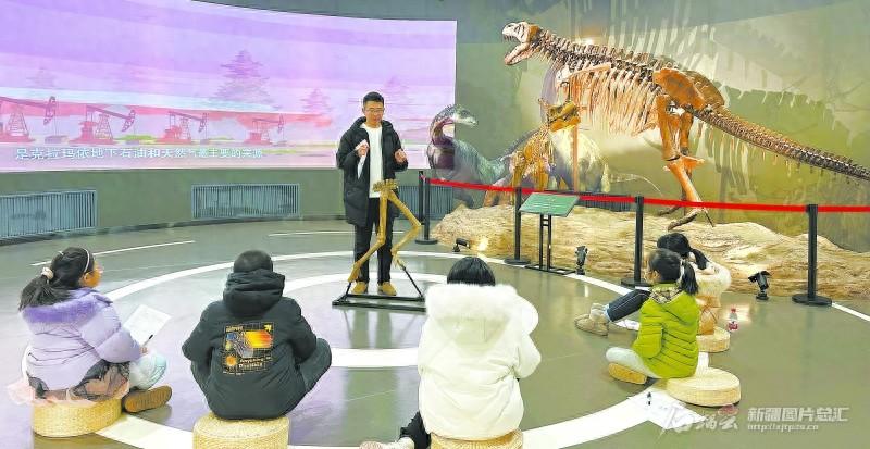 12月17日,学生在克拉玛依市文博院“探秘白垩纪”恐龙科考研学活动中听老师讲解恐龙化石的形成及发掘方式。再克娅·阿不都热衣木摄