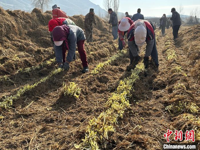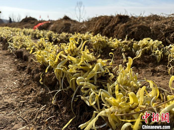 中新网兰州12月12日电 (戴文昌)12日,记者在兰州市西固区西柳沟街道张家大坪村的韭黄种植基地看到,“韭农”们正用铁锹、铁叉、镰刀等农具,齐心掀开草席,拨开麦草,一排排打着“自来卷”的韭黄呈现在眼前,叶黄如金、茎白如玉,麦草下的“黄金芽”迎来了丰收季。