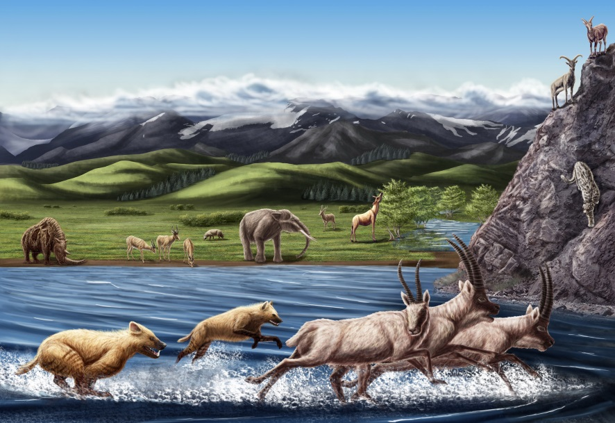 西藏札达盆地上新世哺乳动物群生态复原图。(中国科学院古脊椎所供图)