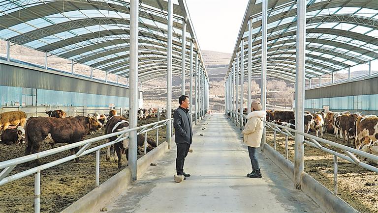 2023年12月21日,走进西吉县兴平乡宁夏吨牛肉牛养殖家庭农场,映入眼帘的是一排排宽敞整齐的标准化圈舍,一头头肉牛膘肥体壮。“目前存栏肉牛500头,满负荷可养900头牛。”养殖场负责人王淘介绍。去年7月,他搭乘产业扶持政策东风,贷款600多万元,购进西门塔尔肉牛等优良品种,进一步扩大肉牛养殖规模。