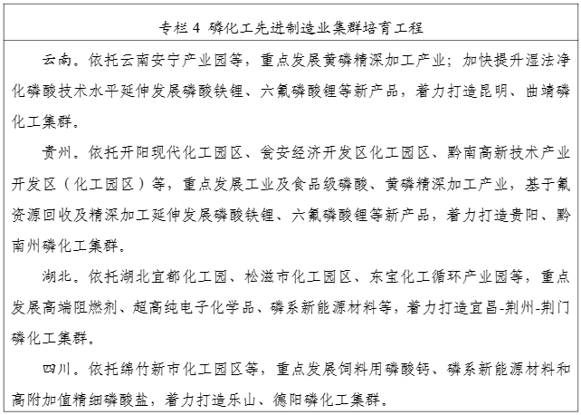 (十)加强战略合作,促进跨地区及上下游协同。加强地区间产业协同,支持新能源、集成电路、生命健康等产业基础较好的地区与“云贵部川”等资源省份加强技术、产业对接,协同打造安全高效的产业链供应链体系。支持行业协会搭建上下游供需对接平台,引导磷矿、磷化工及下游能源材料、电子材料等企业开展上下游战略合作,构建风险共担、利益共享的新型合作机制,增强协同制造能力,提升全产业链竞争优势。
