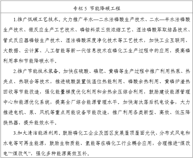 (十一)实施技术改造,打造节能降碳发展模式。加快磷化 工余热余压利用、过程热集成、高效节能等节能降碳技术装备推 广应用,推动能效低于基准水平的磷肥装置开展节能降碳改造。加快能源管理中心建设,开展清洁能源替代,推进能源系统优化。
