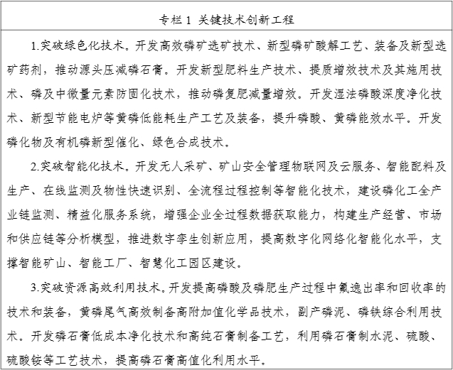 (五)加大技术攻关,筑牢全产业链转型基础。围绕磷矿资源高效开发、共(伴)生资源综合利用、磷化工绿色安全智能化生产、磷石青无害化处理和高值化规模化利用等关键环节,支持产业链上下游企业、科研院所、创新平台等采用“揭榜挂帅”“赛马机制” 等方式协同攻关,加快突破关键技术,全面提升行业绿色、智能、高效发展水平。