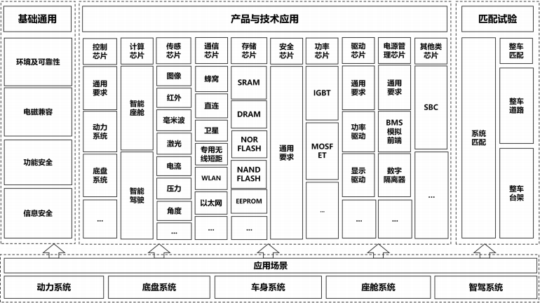 汽车芯片标准体系基于汽车芯片技术结构,适应我国汽车芯片技术产业现状及发展趋势,形成从汽车芯片应用场景需求出发,以汽车芯片通用要求为基础、各类汽车芯片应用技术条件为核心、汽车芯片系统及整车匹配试验为闭环的汽车芯片标准体系技术逻辑结构。以“汽车芯片应用场景”为出发点和立足点,包括动力系统、底盘系统、车身系统、座舱系统及智驾系统五个方面,向上延伸形成基于应用场景需求的汽车芯片各项技术规范及试验方法。