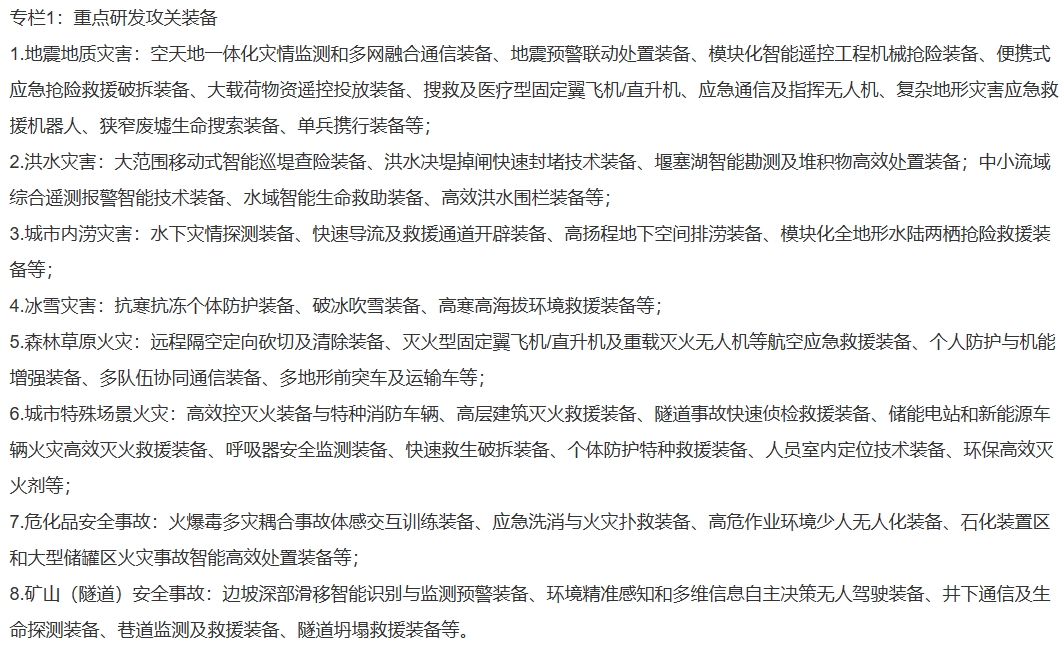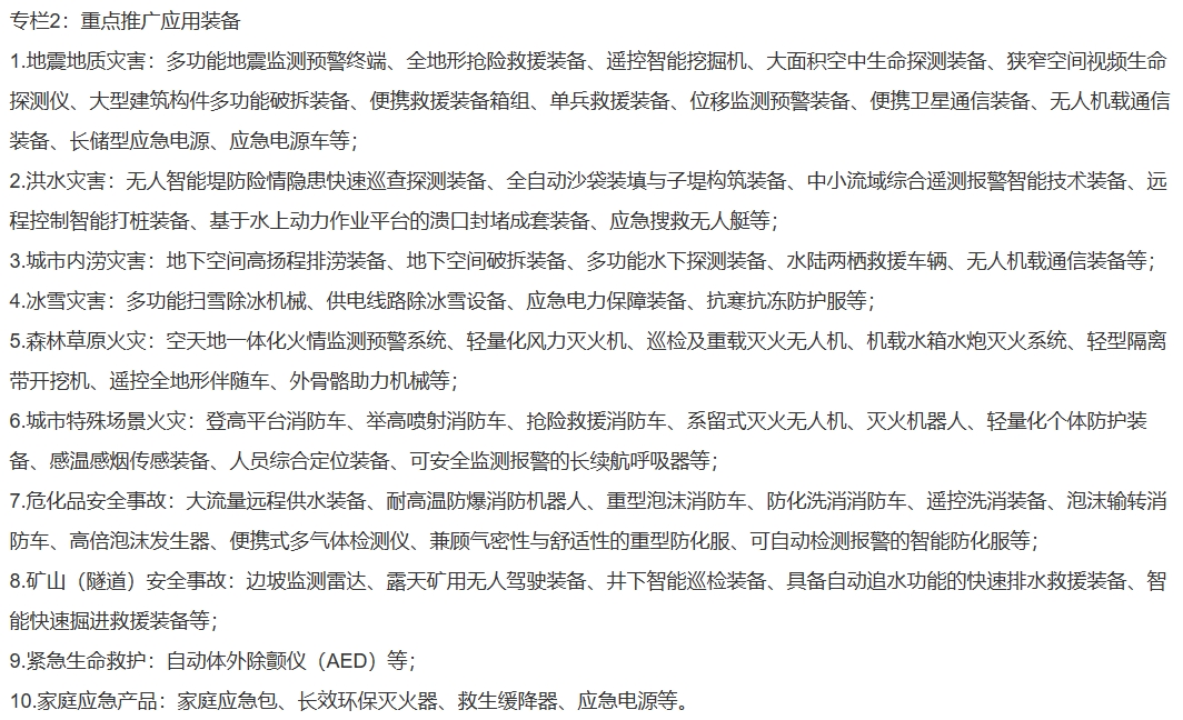 聚焦地震和地质灾害、洪水灾害、城市内涝灾害、冰雪灾害、森林草原火灾、城市特殊场景火灾、危化品安全事故、矿山(隧道)安全事故、紧急生命救护、家庭应急等场景应用的重点安全应急装备,强化核心技术攻关及推广应用,加强先进适用安全应急装备供给,提高灾害事故防控和应急救援处置能力。