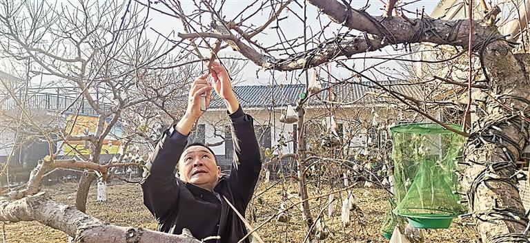 任明在龙泉山庄院认真修剪果树,希望来年再丰收。