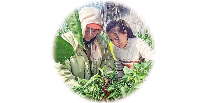 “你看,这垄辣椒长势不错,但还需要摄入铁、锌等微量元素……。”趁着闲暇时间,姜玉荣走进辣椒新品种日光温室,向管理员刘菲分享经验。
