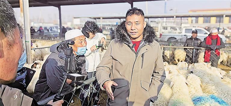 “各位老铁们,你看这只羊膘体不错,有想法的可在线上下单购买!”当日9时许,宁夏宁羴源牛羊肉有限公司负责人纪成军已带着团队赶往九公里农贸市场内,通过线上直播间现场进行羊只交易。