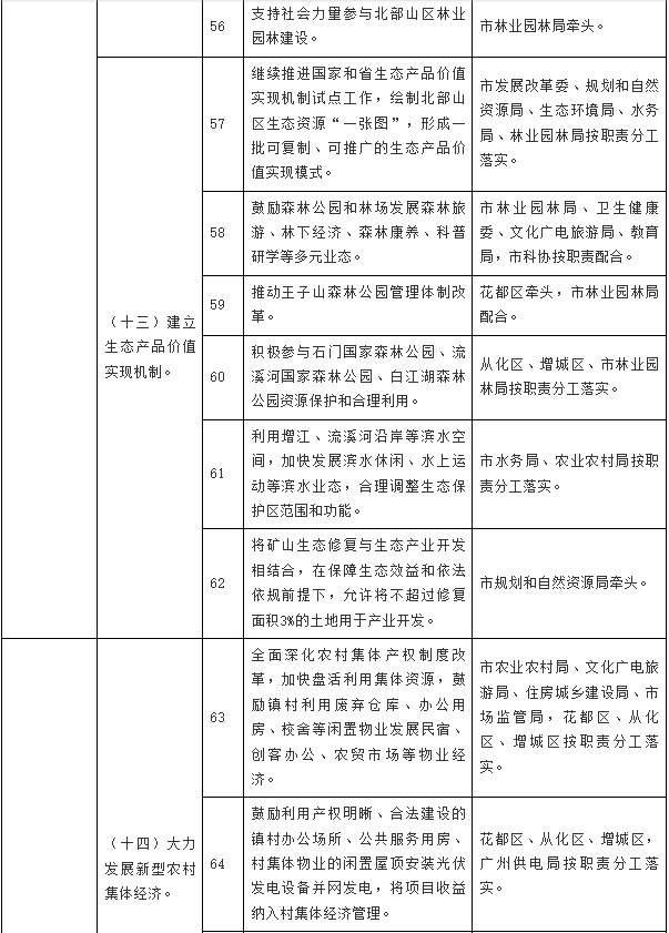 13.建立生态产品价值实现机制。继续推进国家和省生态产品价值实现机制试点工作,绘制北部山区生态资源“一张图”,形成一批可复制、可推广的生态产品价值实现模式。鼓励森林公园和林场发展森林旅游、林下经济、森林康养、科普研学等多元业态。支持花都区推动王子山森林公园管理体制改革,支持从化区、增城区积极参与石门国家森林公园、流溪河国家森林公园、白江湖森林公园资源保护和合理利用。利用增江、流溪河沿岸等滨水空间,加快发展滨水休闲、水上运动等滨水业态,合理调整生态保护区范围和功能。将矿山生态修复与生态产业开发相结合,在保障生态效益和依法依规前提下,允许将不超过修复面积3%的土地用于产业开发。