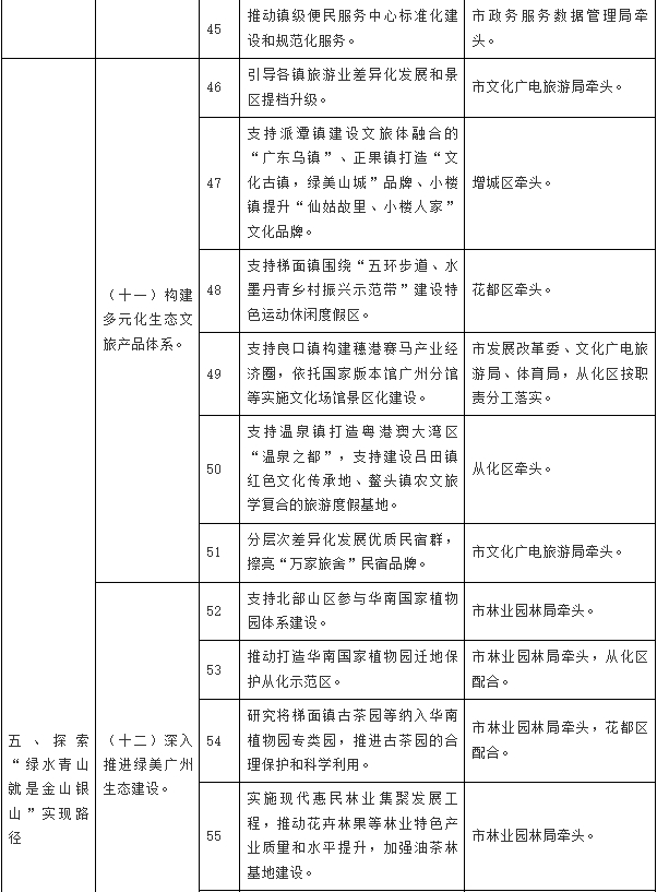 12.深入推进绿美广州生态建设。支持北部山区参与华南国家植物园体系建设,推动打造华南国家植物园迁地保护从化示范区,研究将梯面镇古茶园等纳入华南植物园专类园,推进古茶园的合理保护和科学利用。实施现代惠民林业集聚发展工程,推动花卉林果等林业特色产业质量和水平提升,加强油茶林基地建设,增加优质生态产品供给。支持社会力量参与北部山区林业园林建设,推动花木产业与绿美广州生态建设有机融合。