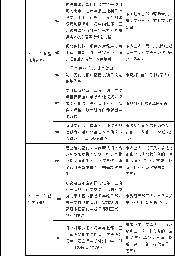 21.健全帮扶机制。建立结对互促、纵向帮扶相结合的新型帮扶协作机制,推进南北互促、镇街组团、区校合作、镇企结对等帮扶协作,明确结对关系。研究建立市直部门与北部山区镇村干部的“双向交流”机制,支持北部山区八镇选派年轻干部,统一安排到市直部门实践锻炼。鼓励市直部门年轻干部到基层一线实践锻炼。各结对帮扶组团每年与北部山区八镇协商制定年度重点帮扶任务清单,建立“年初计划、年中跟踪、年终总结”机制。