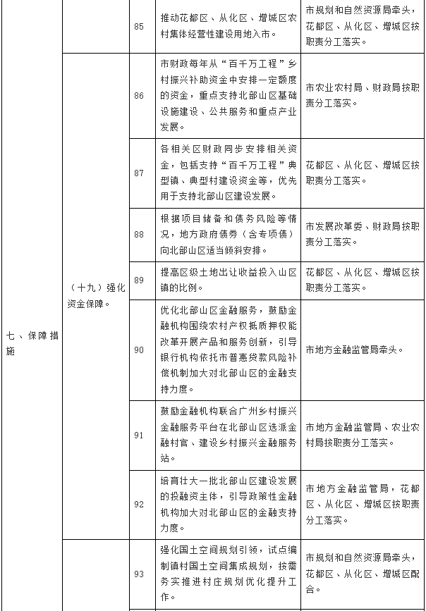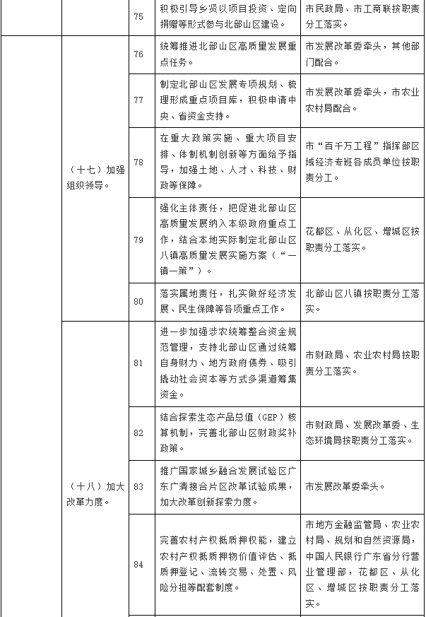 17. 加强组织领导。在市“百千万工程”指挥部领导下,区域经济专班统筹推进北部山区高质量发展重点任务。制定北部山区发展专项规划、梳理形成重点项目库,积极申请中央、省资金支持。市有关单位要在重大政策实施、重大项目安排、体制机制创新等方面给予指导,加强土地、人才、科技、财政等保障。花都区、从化区、增城区要强化主体责任,把促进北部山区高质量发展纳入本级政府重点工作,结合本地实际制定北部山区八镇高质量发展实施方案(“一镇一策”)。北部山区八镇要落实属地责任,扎实做好经济发展、民生保障等各项重点工作。