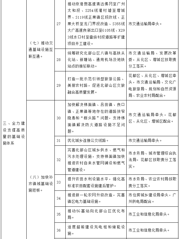 7.推动交通基础设施互联互通。全面对接广州国际综合交通枢纽建设,推动京港澳高速清远佛冈至广州太和段、S254线灌村墟至增城界、S119线正果镇区段改线、正果大桥至龙门界段改造、S355线大广高速良新出口至G105线、X293线水口村至畲族村段道路等扩建项目开工建设。统筹研究北部山区八镇与高铁从化站、新塘站、通用机场及地铁站点的接驳联动。打造一批示范引领型旅游公路、美丽农村路,促进北部山区交旅融合高质量发展。