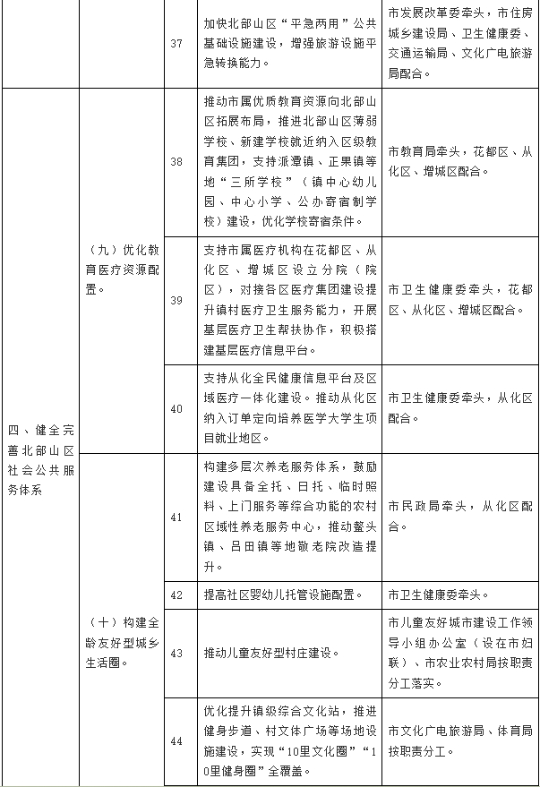 9.优化教育医疗资源配置。加快补齐教育短板,推动市属优质教育资源向北部山区拓展布局,推进北部山区薄弱学校、新建学校就近纳入区级教育集团,支持派潭镇、正果镇等地“三所学校”(镇中心幼儿园、中心小学、公办寄宿制学校)建设,优化学校寄宿条件。支持市属医疗机构在花都区、从化区、增城区设立分院(院区),对接各区医疗集团建设提升镇村医疗卫生服务能力,开展基层医疗卫生帮扶协作,积极搭建基层医疗信息平台,支持从化全民健康信息平台及区域医疗一体化建设。推动从化区纳入订单定向培养医学大学生项目就业地区。