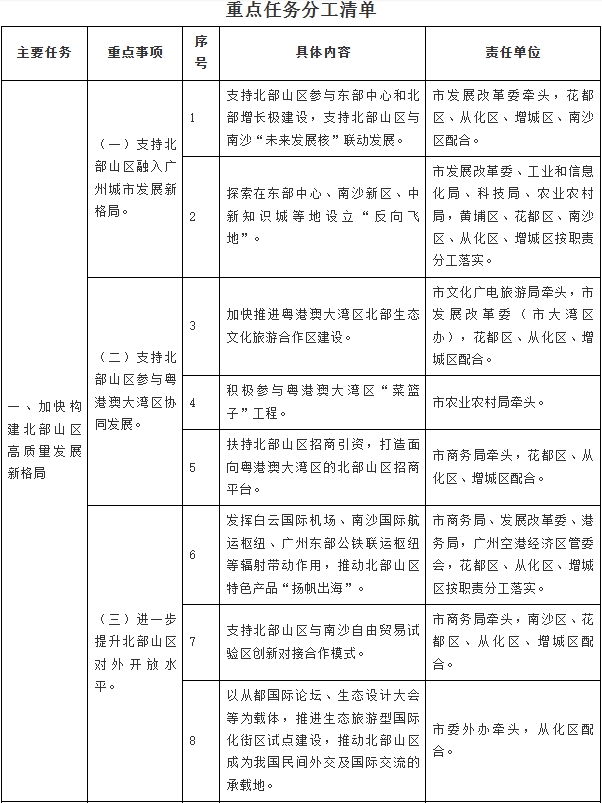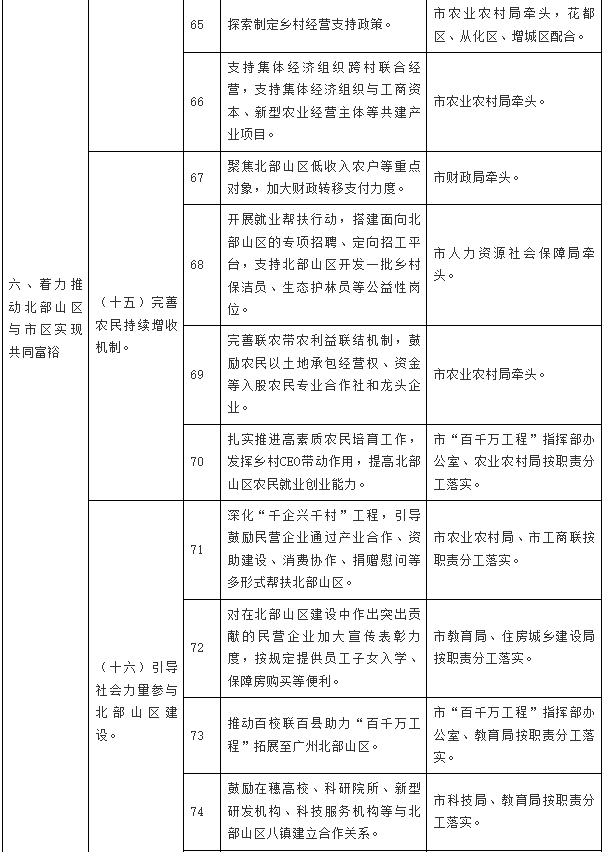 1.支持北部山区融入广州城市发展新格局。在构建“三脉”“三轴”“三核”城市发展格局中,推动北部山区与中心城区联动发展。支持北部山区参与东部中心和北部增长极建设,支持北部山区与南沙“未来发展核”联动发展。探索在东部中心、南沙新区、中新知识城等地设立“反向飞地”,扶持北部山区招商引资,打造特色产业集群。