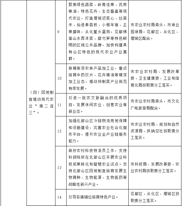 4.因地制宜推动现代农业“接二连三”。聚焦绿色蔬菜、岭南佳果、优质粮油、特色花卉、生态畜禽等现代农业,延伸产业链、贯通供应链、提升价值链,打造增城迟菜心、丝苗米、仙进奉荔枝、小楼年猪、正果腊味,从化鳌头蛋鸡,花都梯面山水西洋菜、甜竹笋等特色鲜明的区域公共品牌,加快构建具有山区特色的现代农业产业集群。做精做深农林产品加工业,重点培育中药饮片、花卉精油等精深加工业态,推动预制菜产业规范有序发展。引进一批农文旅融合的优质项目,发展休闲农业、创意农业等新业态。加强北部山区冷链物流用地保障和设施建设,完善农业社会化服务平台,提升农业全产业链服务能力。做好农村科技特派员工作,支持科研院所在北部山区开展农业科技成果转化和智慧农业试点。支持北部山区因地制宜培育发展生物育种、生物能源、生物医药等战略性新兴产业,引导各镇错位培育特色产业。