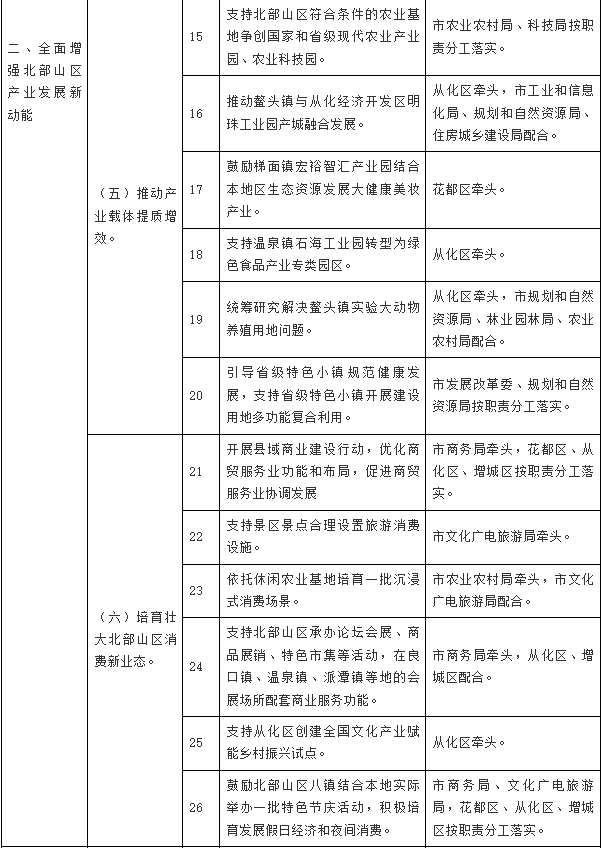 6.培育壮大北部山区消费新业态。开展县域商业建设行动,优化商贸服务业功能和布局,促进商贸服务业协调发展。支持景区景点合理设置旅游消费设施,依托休闲农业基地培育一批沉浸式消费场景。支持北部山区承办论坛会展、商品展销、特色市集等活动,在良口镇、温泉镇、派潭镇等地的会展场所配套商业服务功能。支持从化区创建全国文化产业赋能乡村振兴试点。鼓励北部山区八镇结合本地实际举办一批特色节庆活动,积极培育发展假日经济和夜间消费。