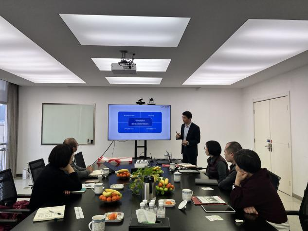 在会议室,徐廉久市场总监对企业的发展历程、产品定位、产品标准、先进技术等进行了介绍。刘磊总经理表示浙江佑谦特种材料有限公司一直致力于研发和生产高品质、环保型的特种涂料,公司秉持可持续发展理念,注重低碳环保,力求在满足市场需求的同时,减少对环境的影响。希望佑谦公司借助宁波涂协的平台能与更多同行交流合作,共同为构建美好、绿色的未来贡献力量。