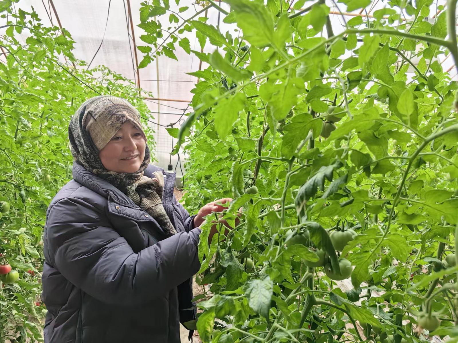 宁夏旱作节水科园区设施农业基地务工农户在项目实施温棚内打理作物。