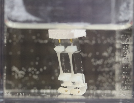 为了建造一个动作更灵活、更精细的机器人,研究人员设计了一种模仿人类步态并在水中操作的生物混合机器人。该机器人有一个泡沫浮标顶部和加重的腿,能帮助它在水下直立。机器人的骨架主要由硅橡胶制成,可弯曲以适应肌肉的运动。然后,研究人员将实验室培养的骨骼肌组织条连接到硅橡胶和两条腿上。