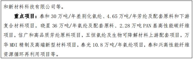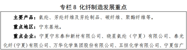 10.高性能化纤产品。借助宁东煤化工产业基础, 实施高性能纤维产业培育工程, 全力打造化纤制造集群、建设“ 中国氨纶谷 ”。重点发展氨统、芳纶、碳纤维等差别化、功能性纤维,加快构建“原料- 中间体-化学纤维-复合材料及制品 ”先进完整产业链。支持企业尽快攻关突破高性能纤维规模化、稳定化低成本制备技术,提升纤维及复合材料的智能、绿色生产水平。 鼓励可吸收缝合线、血液透析材料以及满足热、生化、静电、辐射等防护功能要求的化纤材料研发,推动全区高端产业用纺织品规模化生产实现突破。到 2027 年,化纤生产产值力争突破200 亿元。