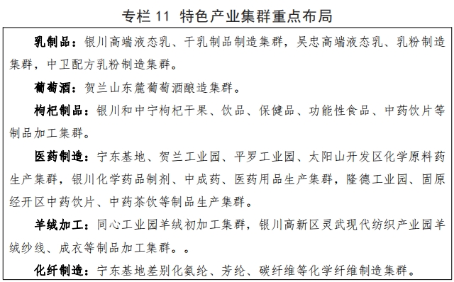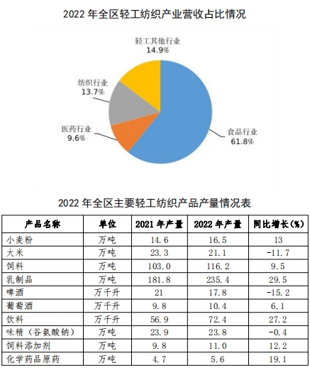 2. 主导行业快速发展。以食品、 医药、纺织和轻工其他行业为重点的主导行业,各具特色, 近年来得到快速发展。食品行业特色发展 。在乳制品、构纪制品和葡萄酒等特色产品加工制造的引领下, 规模持续壮大、发展成效显著,2022 年,178家规上企业完成营业收入 420.4 亿元, 同比增长 5.6%,占全产业规上企业总营收的 60.8%。12家规模以上乳制品企业生鲜乳日加工能力超过 1 万吨, 宁夏伊利建成全球最大液态奶单体工厂;构纪深加工制品达 10 大类 100 余种, 出口 40 多个国家;国家葡萄及葡萄酒产业开放发展综合试验区建设挂牌启动,建成酒庄 116 家,年产葡萄酒超过 1 亿瓶,连续多年斩获国际国内多项顶级大奖,远销 40 多个国家和地区。医药行业创新发展。形成以化学药品原料药(含生物发酵)、化学药品制剂、中药饮片加工和中成药生产为主的产业体系, 共有 368 个品种获国家药品批准文号,首个双胍类降糖原料药取得上市销售许可,泰乐菌素全球市场占有率第一,盐酸四环素全球独家生产,VC原料药跡身世界六大主要供应地,中药材种植加工规模不断扩大。2022 年,29 家规上企业实现营业收入 68.5 亿元 ,同比增长13.1% 。现代纺织初具规模 。建成近 200 万锭纱线和近4700万米织物产能,形成以贺兰工业园 、金积工业园为中心的棉纺集群; 持续盘活灵武市原有资源,羊绒加工全产业链优势正在复苏; 宁东能源化工基地布局“中国氨纶谷 ”建设,加速发展高性能化纤材料生产,建成氨纶产能 9.6 万吨。2022 年,59 家规上企业实现营业收入100.7 亿元, 同比增长 11.1%。轻工其他行 业稳健发展。包装印刷、塑料制品、毛皮制品等细分行业稳中有进,新建了 一批延链补链项目,实施了一批信息化、智能化和工艺技术改造项目,规模以上企业数量有所增加,龙头企业 实力不断增强。2022 年,78 家规上企业实现营业收入101.4 亿元 ,同比增长 9.1%。