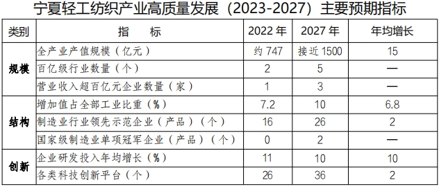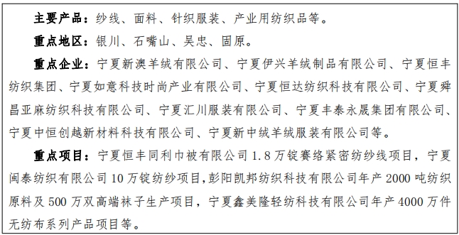 (三)纺织行业。 以承接东部产业转移为契机,加快建设利通区棉纺产业集群、灵武同心羊绒产业集群、宁东化纤产业 集群 , 恢复羊绒加工、提升棉麻纺织、壮大化纤生产,鼓励发 展产业用纺织品和功能性差别化纤维,支持拓展个性化服装定 制、 品牌代工、自主研发能力,鼓励提升智能化生产水平, 打 造毛、棉、麻、化纤多种纤维共同发展、多元化布局、 多链条 并行的现代纺织原料生产格局。结合市场需求和劳动力资源实际,稳健发展羊绒成衣和服装加工。到 2027 年,纺织服装行业产值力争超过 300 亿元以上,建成全国现代纺织原料生产基地。