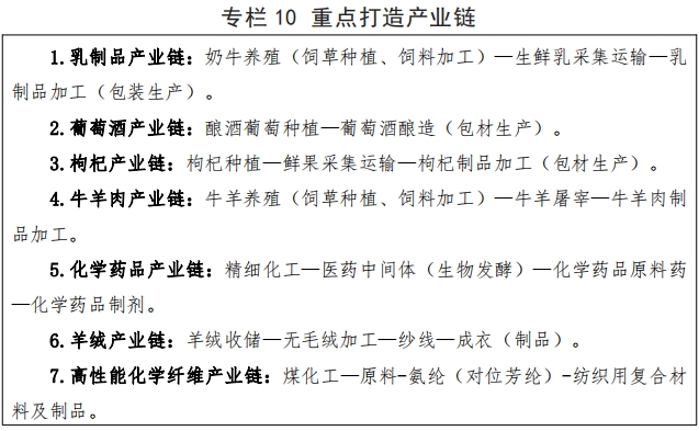 (一)产业链条锻造工程。 紧扣“ 六特 ”“ 六优 ”产业发展形成的新基础新优势,加快布局新赛道、建强产业链。推动具备规模和配套优势的产业链升级改造, 增强关键节点和链主企业市场竞争力。 围绕葡萄酒、乳制品、构纪制品、化学纤维等特色行业, 加强招商引资,推动产业链延伸补强。支持链主企业发挥引领带动作用, 积极构建上下游关系稳定、质量标准统一、多方共赢、可持续发展的供应链体系。建立产业链运行监测机制, 加强风险评估和信息服务。到 2027 年,重点打造 7条产业链,推动产业深加工规模实力不断增强,成为产业发展重要支撑。