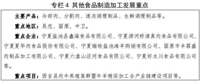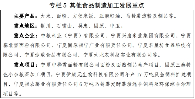 5.其他食品制造加工。结合全区及周边省区农副产品资源实际 , 适度发展粮油 、饮料 、 肉制品 、马铃薯制品 、饲料等农 副食品加工 , 鼓励发展调味品、方便食品、罐头食品、食品添加剂等生产,努力在提升精深加工能力水平, 研发高附加值产品,打造宁夏特色品牌,壮大龙头企业,延伸产业链上下功夫。到 2027 年,其他食品加工制造产值力争突破 300 亿元。