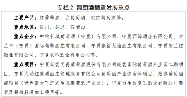 2.葡萄酒酿造。 以宁夏国家葡萄及葡萄酒产业开放发展综合试验区为载体, 加快构建现代葡萄酒产业体系、生产体系、经营体系和技术研发推广体系,全力打造“ 世界葡萄酒之都 ”。高起点建设品牌酒庄,加强酒庄分级管理,培育壮大经营主体,提升企业创新能力,增加多元产品供给,研发推出无醇葡萄酒、 葡萄蒸馏酒、佑餐系列酒等新品种,满足市场多样化、多系列、多口味并存需求。突出“ 贺兰山东釐葡萄酒 ” 区域品牌价值,一体推进区域公用品牌、企业品牌、产品品牌建设,建立产区统一的品牌信用监管机制, 构建品牌保护全方位支撑体系。到2027 年,全区年产优质葡萄酒 3 亿瓶以上,酿造产值突破 150亿元,建成全国重要的葡萄酒生产基地。