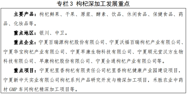 3.枸杞深加工。充分发挥“宁夏枸杞”品质、品牌和深加工技术优势,巩固干果、原浆、籽油等传统产品市场地位,加强叶黄素、玉米黄纸、糖肽、酵素等高端产品生产,不断提升市场竞争力, 筑牢“ 宁夏枸杞 ”在国内外的标杆和领军地位。 支持枸杞深加工企业结合食品、保健、医药、康养等市场需求,加强新产品研发和成果转化,增加保健食品、特膳食品、特医食品、医药产品、化妆品等新品种生产,提高枸杞叶、茎利用率,不断丰富产品线、提高附加值。到 2027 年,枸杞鲜果加工转化率超过50%,深加工产值超过 200 亿元,建成全国重要的枸杞制品生产基地。