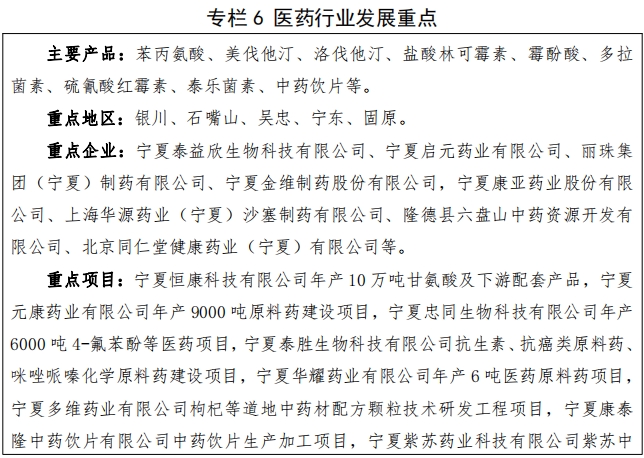 (二)医药行业。聚焦化学原料药及其制剂和特色中药方向, 加强产业链延伸和自主创新能力培育, 推动原料与制剂一体化发展。鼓励医药企业相对集中的园区建设医药产业园或聚集区,以集群式发展模式壮大一批宁夏优势品种和知名品牌。到2027年,全区医药产业产值力争达到 120 亿元。