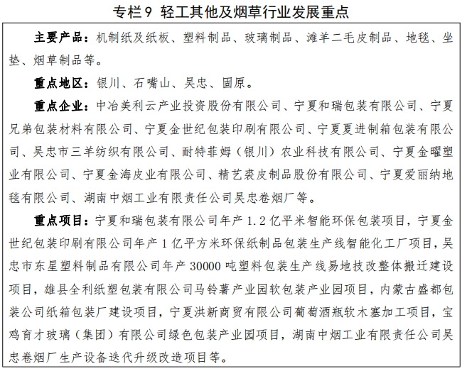(四)轻工其他及烟草行业。 着眼于完善产业配套、弥补产业短板、促进绿色消费等方向, 针对包装印刷、毛皮加工、 塑料制品、家具工美、 日用化学品等行业,加强政策支撑保障, 以市场化手段构建具有更强创新力、更高附加值、更加可持续 发展的现代轻工产业体系。积极做好湖南中烟吴忠卷烟厂稳定发展支持服务工作。到 2027 年,轻工其他行业产值力争达到150亿元 , 烟草制品产值稳定在 20 亿元以上。