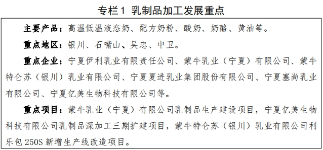 1.乳制品制造。依托宁夏牛奶高品质优势和不断增长的产量基础, 积极引进光明、君乐宝等国内乳业头部企业,大力发展乳制品本地化、高端化制造,打造国内领先的高端乳制品生产基地,形成银川、吴忠两大核心产区,并逐步完善饲料加工、包装印刷、装备生产等上下游产业链, 打造乳制品及相关工业产业链和产业集群。鼓励企业响应国家“ 三减三健 ”全民健康生活方式膳食行动倡导,持续优化生产工艺和产品结构,不断推出低糖、低脂、高钙新产品,加大低温乳、发酵乳、婴幼儿(中老年) 配方粉及奶酪、奶油、冰漠淋等高附加值乳制品生产,大力开发满足不同人群健康需要的乳蛋白、益生元、乳清、乳糖等功能性乳品基料。到 2027 年,建成全国重要的牛奶原料基地和乳制品生产基地,全区乳制品加工产值力争达到 300 亿元以上。