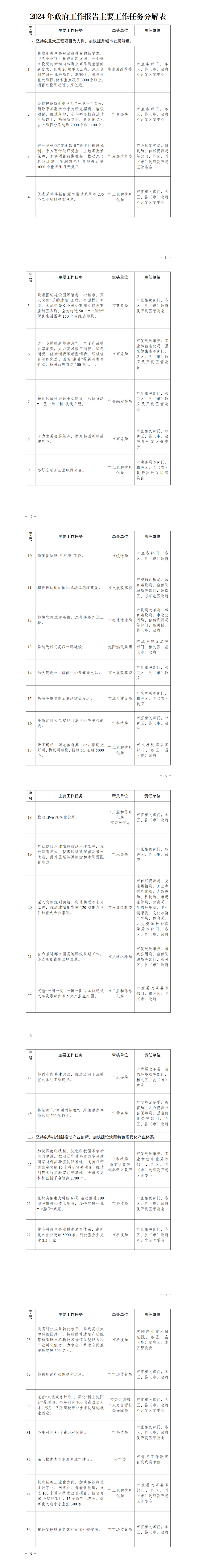 沈阳市第十七届人民代表大会第三次会议批准的《政府工作报告》确定了2024年全市经济社会发展的预期目标,明确了政府工作的总体要求和主要任务。为推动各项任务有效落实,现将《2024年政府工作报告主要工作任务分解表》印发给你们,请认真对照各自承担的工作任务,细化工作目标、明确工作进度、落实工作责任,确保各项任务如期完成。