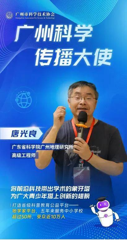 唐光良长期为地理科普创新与传播的公益事业无私奉献。在科研之余,依托广州市科技创新环境,结合地理科学、地理空间智能的前沿科技成果,设计了形式新颖的科普和传播活动,创作系列地理科技文创作品,打造了省级科普教育公益平台——地学家平台。