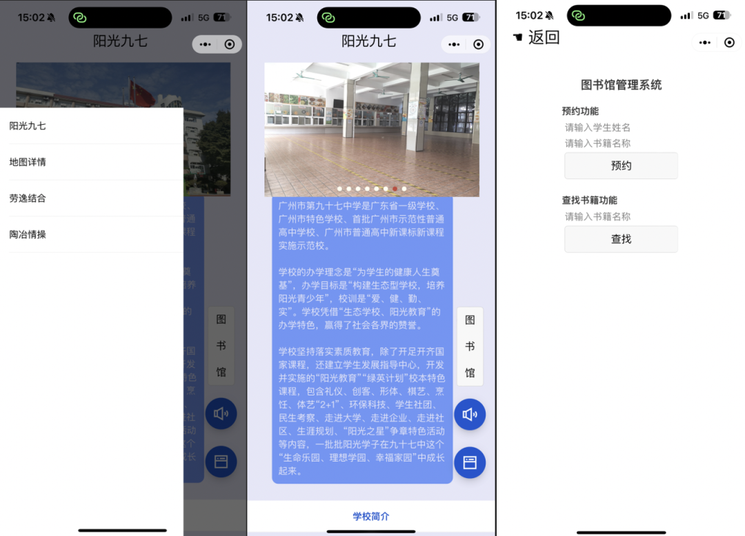 小程序教育平台为数学知识的运用提供更好的载体。在校园场景发现实际问题,并用数学思维寻找解决方法后,学生可以通过小程序教育平台,用编程把数学方法具象为可以解决实际问题的小程序。广州市九十七中晓园学校的同学们的小程序,除了学校简介、学校建筑的三维视图等功能外,还尝试打造了图书馆管理系统。