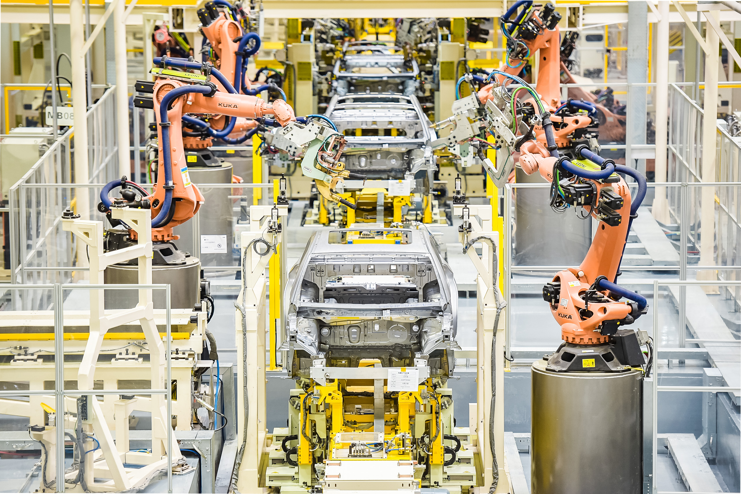 新能源汽车全产业链在大湾区迅速崛起,形成了以广州、深圳、佛山三地为核心的整车制造集聚区。图为广汽埃安焊装车间,自动化生产线正在作业。