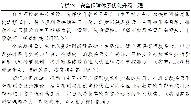 到2025年底,政务服务线上线下深度融合、协调发展,100%高频政务服务事项实现全省无差别受理和同标准办理,跨地域、跨层级、跨部门、跨业务、跨系统的社会协同治理格局基本形成,五级贯通、协同联动、集约高效的协同办公水平大幅提升,政务数据开发利用场景进一步丰富,数据开放水平大幅提升,信息系统自主可控率达到80%,形成全方位、立体化的安全保障防护体系。