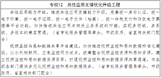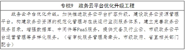 ——“五个一”数字基础底座。进一步完善全省政务“一朵云”、电子政务“一张网”、政务大数据“一中心”、共性应用支撑“一平台”和安全保障“一城墙”。