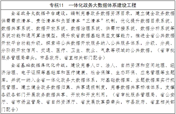 加强政务数据统筹管理。健全全省政务大数据管理协调机制,强化政务部门的数据管理职责,落实数据归集、共享、开放、应用、安全、存储、归档等责任。深入实施政务数据治理“12321工程”,建设全省政务大数据平台,建设完善数据分析、数据目录、数据开放、数据治理、供需对接、数据共享等六大核心系统,以及通用算法模型和控件,形成全省数据管理总枢纽、数据流转总通道、数据服务总门户。持续推进政务数据供需对接,推动政务数据属地返还和按需回流。