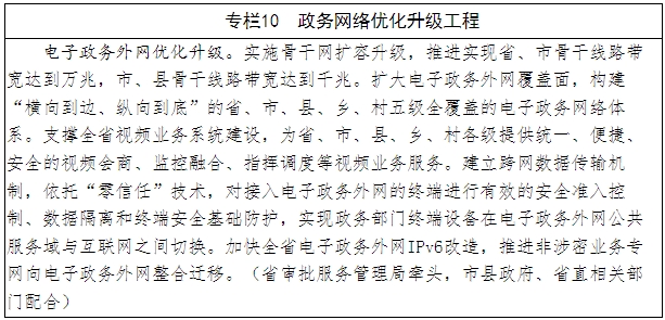 推动电子政务外网升级改造。加快推进电子政务骨干网扩容升级,实现省、市电子政务骨干线路带宽达到万兆,市、县电子政务骨干线路带宽达到千兆。按照“一网双平面”的架构,推动全省电子政务外网IPv6改造,实现数据、视频等多业务流量的统一承载。在安全可控的前提下,推进电子政务外网按需向企事业单位接入,逐步满足各行业部门的个性化网络服务需求。