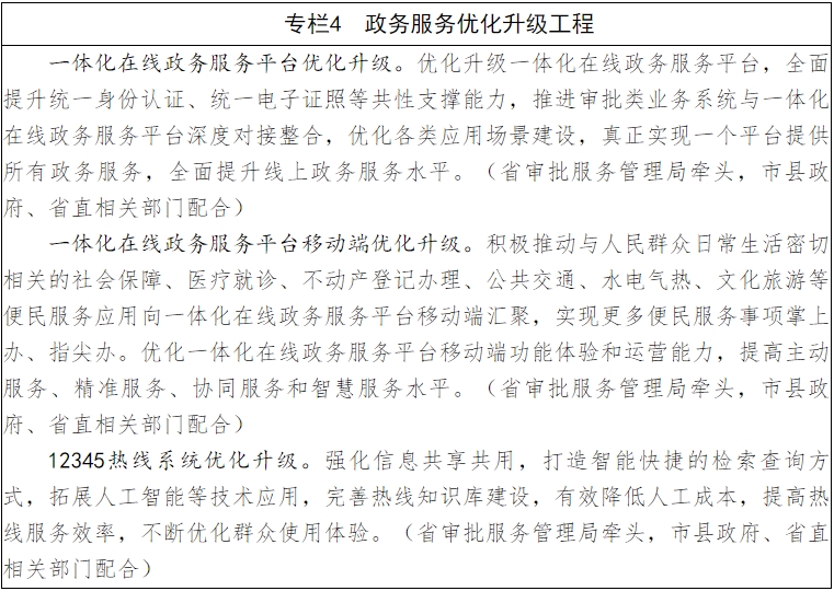 构建泛在可及的政务服务体系。充分发挥全省一体化在线政务服务平台的枢纽作用,推动政务服务线上线下标准统一、全面融合和服务同质,构建全时在线、渠道多元、全省通办的一体化在线政务服务平台,实现网上办事“一次注册、多点互认、全网通行”。优化一体化在线政务服务平台移动端建设,整合各类政务服务移动端应用,不断拓展企业和群众服务事项范围,提升服务体验和整体运营能力。优化线下办事大厅设置,按照“前台综合受理、后台分类审批、综合窗口出件”的模式,合理设置无差别或分领域综合办事窗口。优化12345热线运行服务机制。推进全省乡镇、街道7×24小时自助政务服务全覆盖,实现政务服务“就近办、家门口办”。