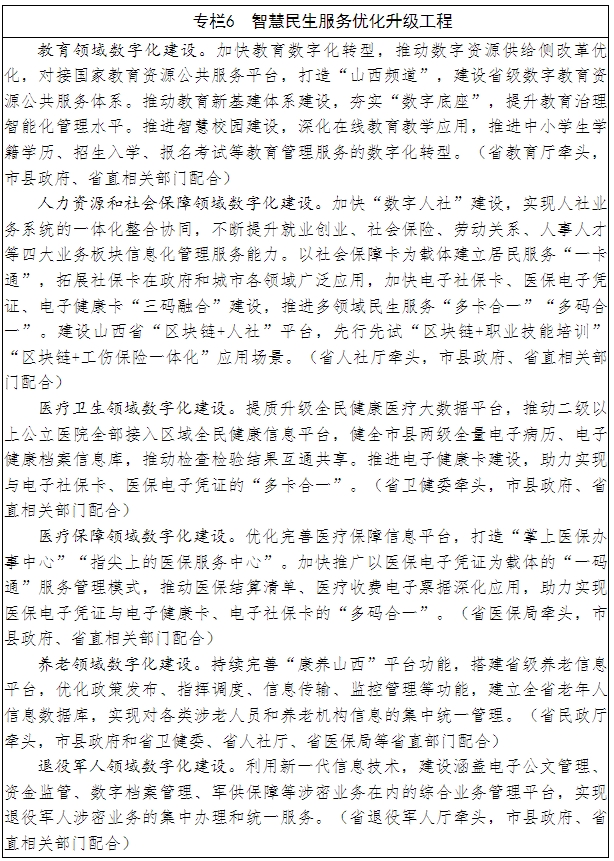 持续推进智慧民生建设。聚焦教育、社保、医疗、养老、抚幼、就业、助残等重点领域,推动数字化服务的普惠应用,持续提升群众获得感。深化“互联网+教育”建设,建设“互联网+教育”大数据平台,推动全省教育数字化转型。加快“数字人社”建设,拓宽社会保障卡“一卡通”应用领域,推进电子社保卡、医保电子凭证、电子健康卡“三码融合”,实现多领域民生服务协同共享,持续推进“区块链+人社”国家区域创新应用试点建设。加快推进智慧医疗建设,推动居民电子健康码的普及应用,加快异地转诊、就医、住院、医保等医疗全流程在线办理。深化智慧养老建设,持续优化“康养山西·夏养山西”品牌。持续优化“互联网+退役军人”服务,建立退役军人网上办事专区,推动退役军人政务服务事项全程网办和一网通办。